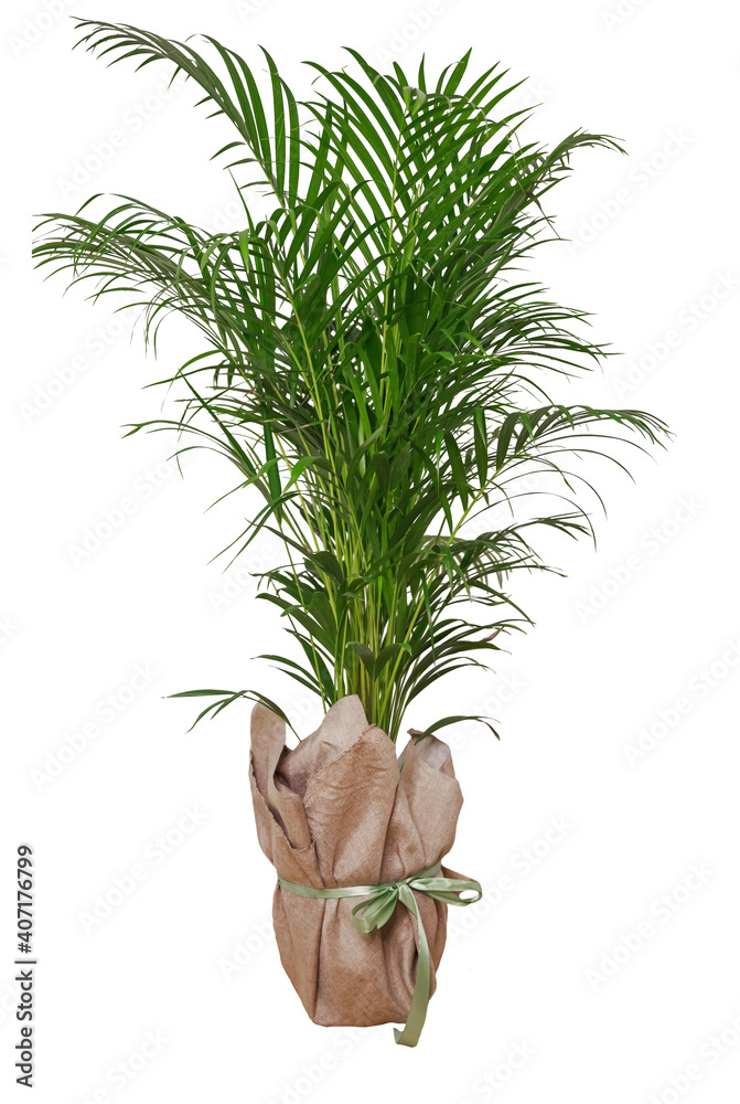 Minimal tropical leaves houseplant home decor. Kentia or Areca decorative palm against white wall. Isolated plant of palm tree in pot isolated on white background. Home gardening, love of houseplants