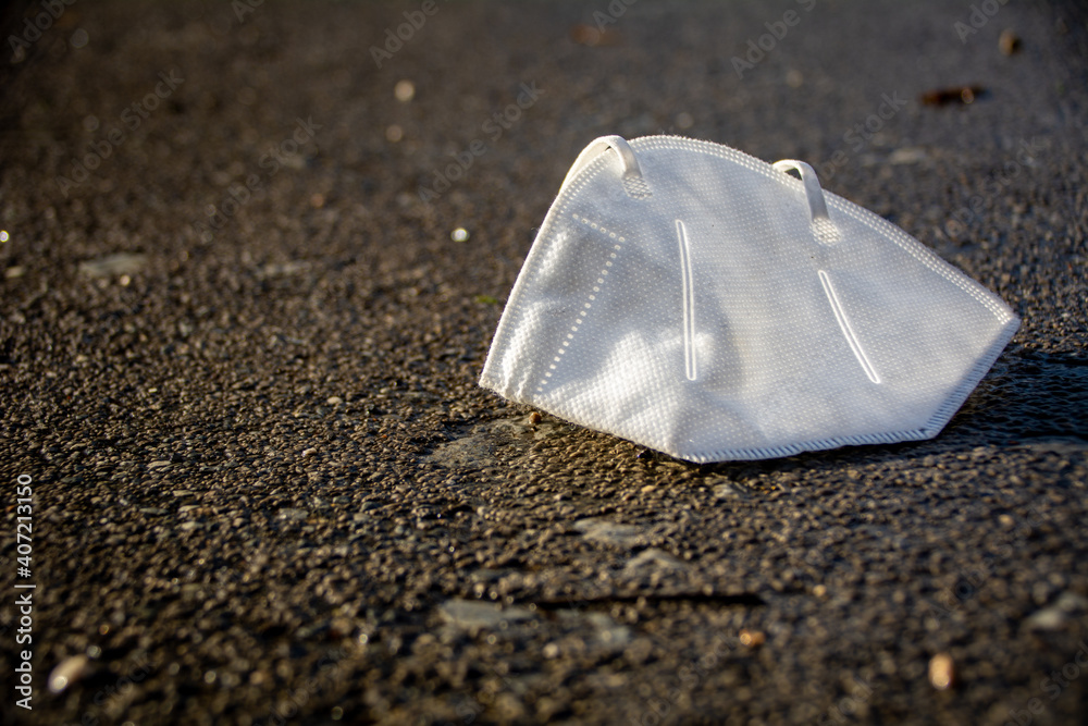 Health care and protection from COVID-19 concept. An FFP2 protective face piece (PPE) thrown away after use. Waste by medical mask on a street.