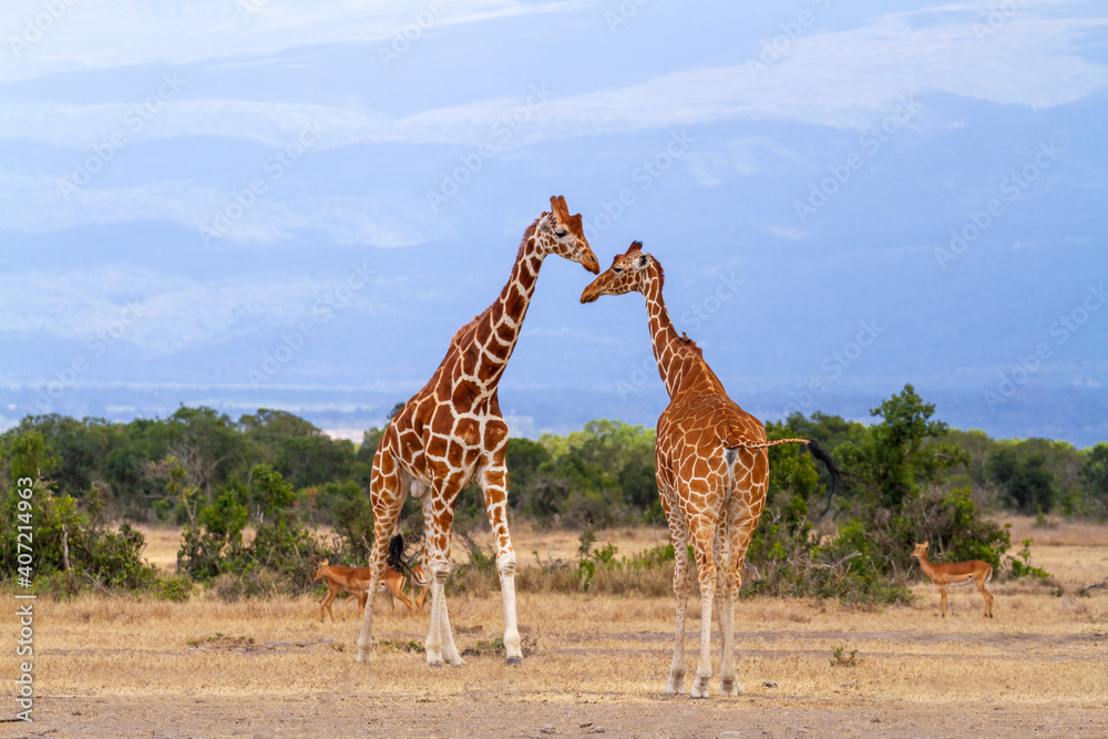 Two giraffes, male and female check scent, behavior behaviour to determine reproductive status. Ol Pejeta Conservancy, Kenya, Africa. Reticulated giraffe or Giraffa camelopardalis reticulata