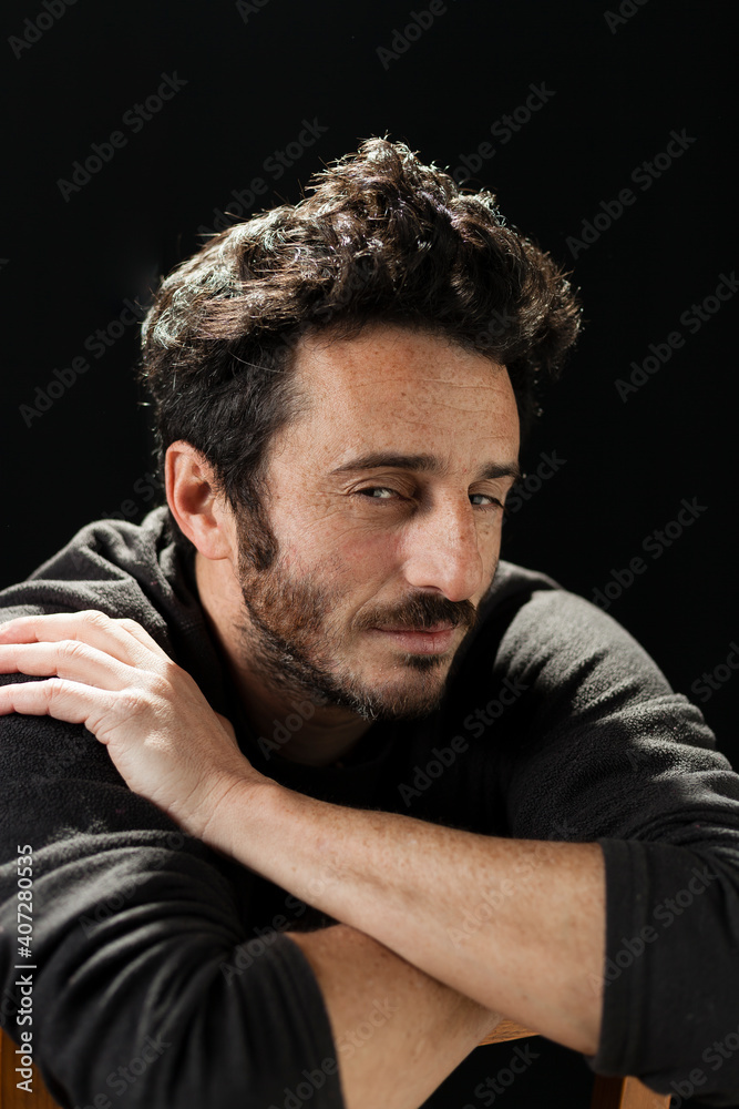 White attractive adult man with beard and back light sitting on a chair on black background.