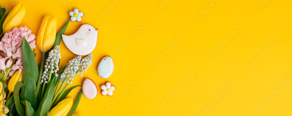 Happy Easter. Multi-colored pastel easter cookies gingerbread, seasonal flowers tulips on bright yellow background. Easter concept, copy space, flyer, banner, coupon, greeting card, invitation