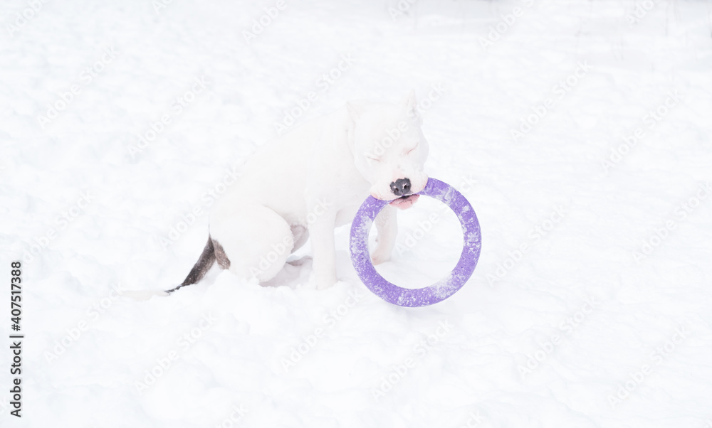 White American bulldog puppy playing with puller in winter forest. Dog.