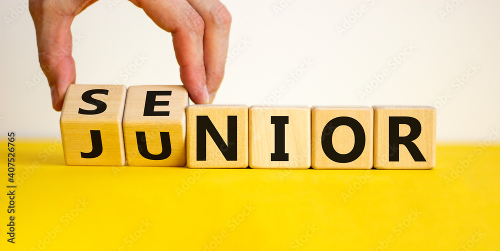 From junior to senior symbol. Businessman turns cubes and changes the word 'junior' to 'senior'. Beautiful yellow table, white background, copy space. Business and junior or senior concept.