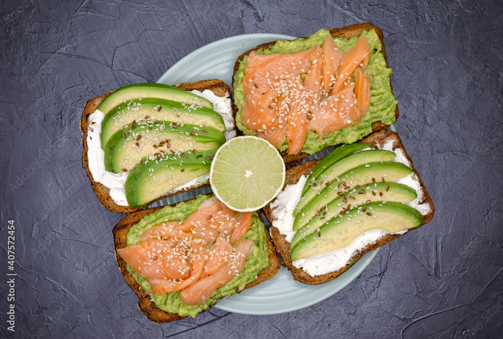 Delicious breakfast. Open sandwich with rye bread, avocado, smoked salmon on grey marble background. Tasty fresh sandwich with trout, guacamole. Set of various open sandwiches. Healthy food concept