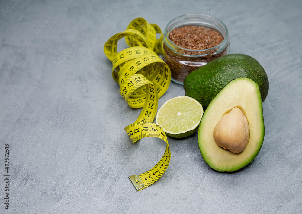 Cleansing of the body. Vegan concept. Food for weight loss. Proper nutrition. Raw avocado with measuring tape on grey background. Healthy balanced diet concept, weight loss, calorie counting.