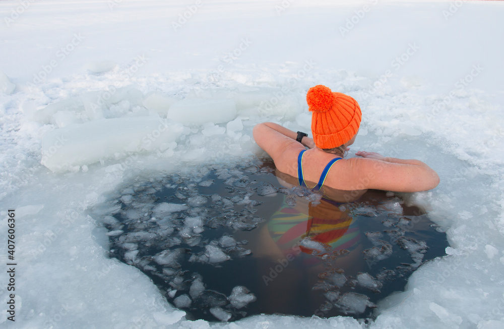 a woman in an orange hat bathes in an ice-hole in winter, extreme swimming at -15 frost, view from the back