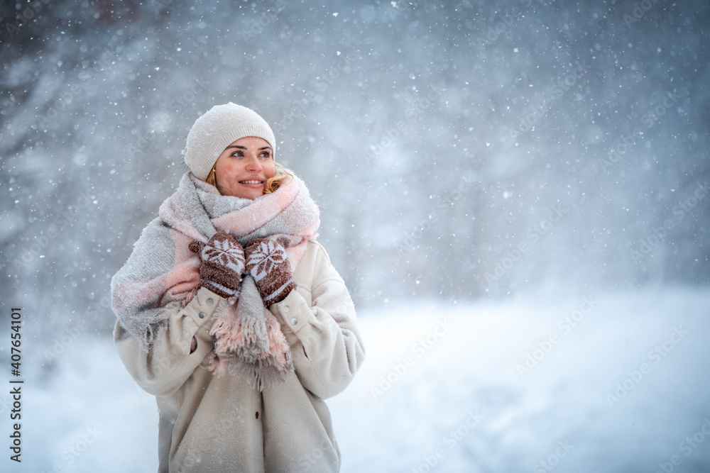 Smiling woman enjoying winter among snow outdoor