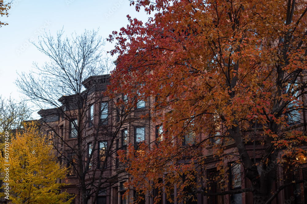 Row of Old Brownstone Homes in Park Slope Brooklyn New York with Colorful Trees during Autumn