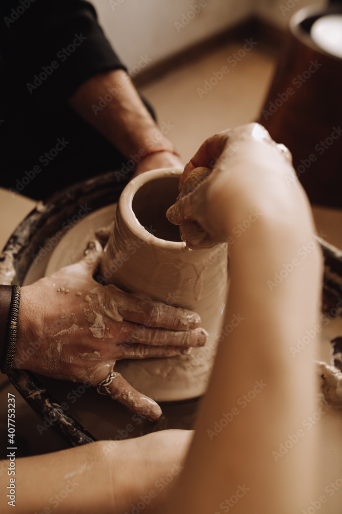 the hands of a girl and a man stained with clay make a jug on a potter's wheel