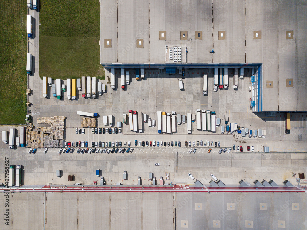 Buildings of logistics center, warehouses near the highway, truck parking process, view from height, a large number of trucks.