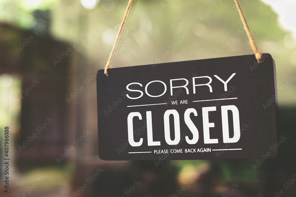 sorry closed sign on shop door. Text on cafe front or restaurant hang on door at entrance. vintage tone style.