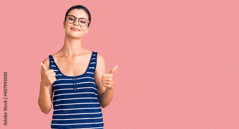 Young beautiful woman wearing casual clothes and glasses success sign doing positive gesture with hand, thumbs up smiling and happy. cheerful expression and winner gesture.