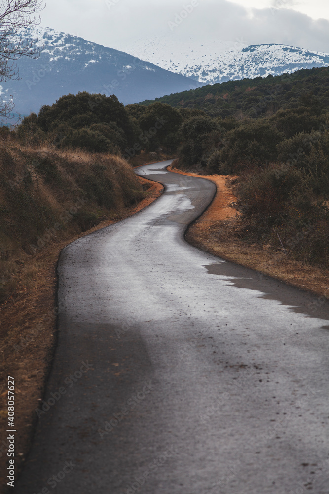 A lonely and silent road after the rain, full of curves in the direction of Litago from the small town of Trasmoz, in the Moncayo Natural Park, seen in the background, snowy, Spain.
