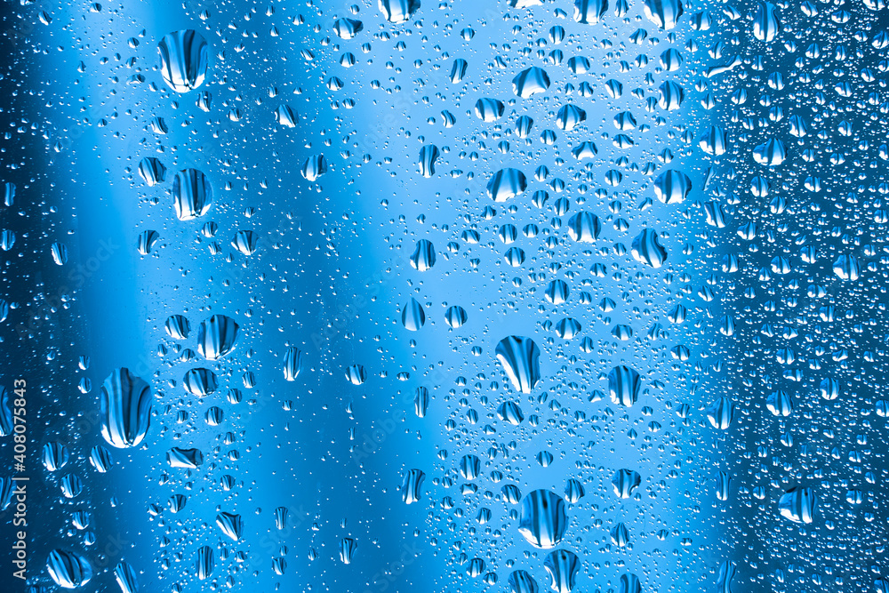 Abstract background ornament with water drops.Raindrops on the glass in rainy weather.The glittering, shiny surface of water on glass.Water drops in the form of balls or spheres.Blue raindrops