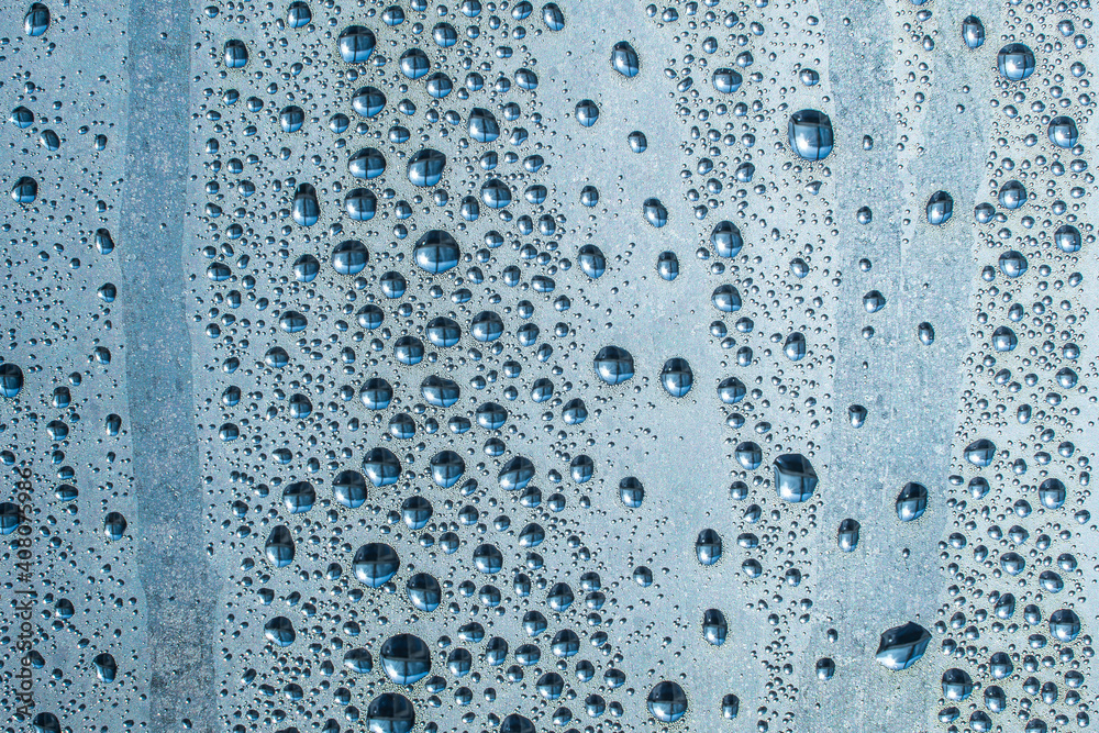Abstract background ornament with water drops.Raindrops on the glass in rainy weather.The glittering, shiny surface of water on glass.Water drops in the form of balls or spheres.Blue raindrops