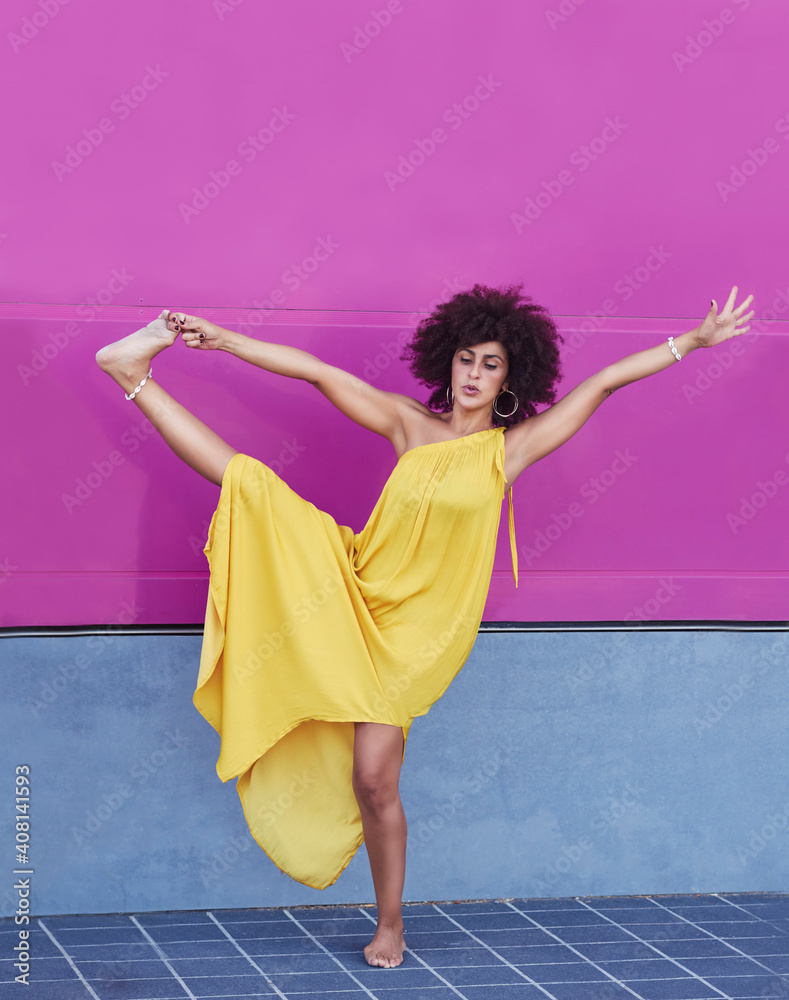 Woman with afro hair. She has a yellow dress and behind is a purple background