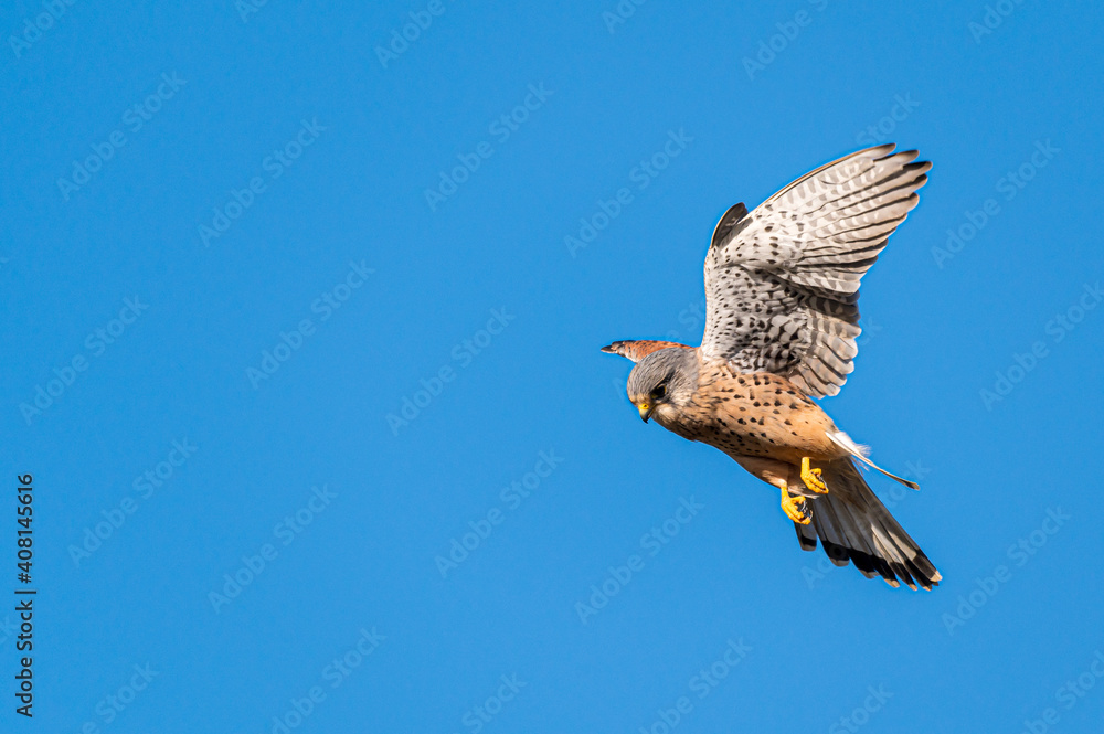 Male kestrel bird of prey, Falco tinnunculus, hovering hunting for prey