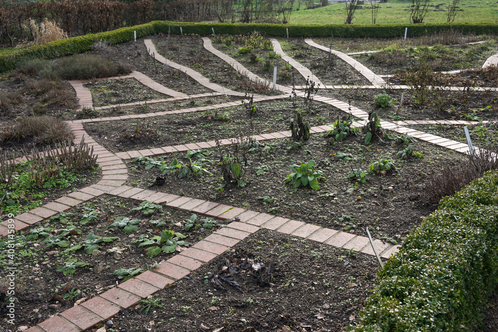 Vegetable and herb garden with harvested beds, cut perennial plants and brick footpaths in between waiting for spring