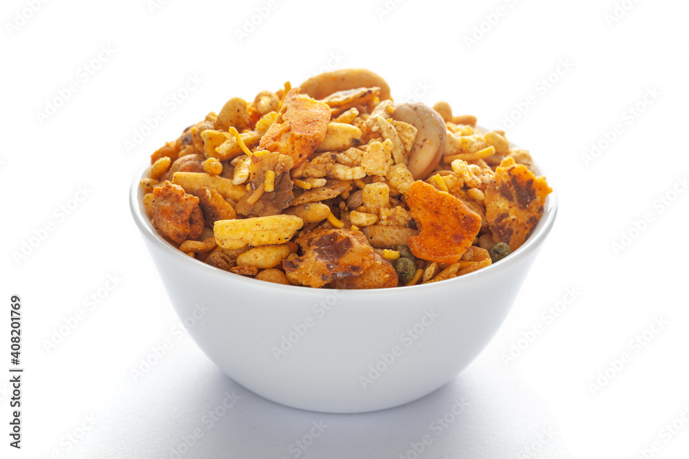 Pile of Indian spicy snacks (Namkeen) - 'All in one' in a white bowl, made with fried peanut, corn flakes, sweet pea, pulses, cashew nuts, etc. side view, against the white background.