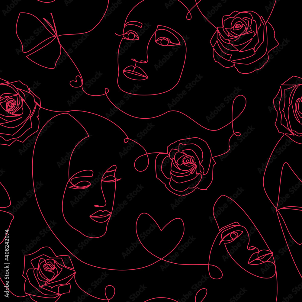 One line drawing abstract contamporary art. Modern seamless pattern with women faces