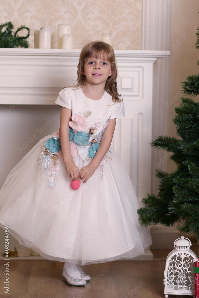 cute little blond baby girl with long hair in white dress smiling grimacing