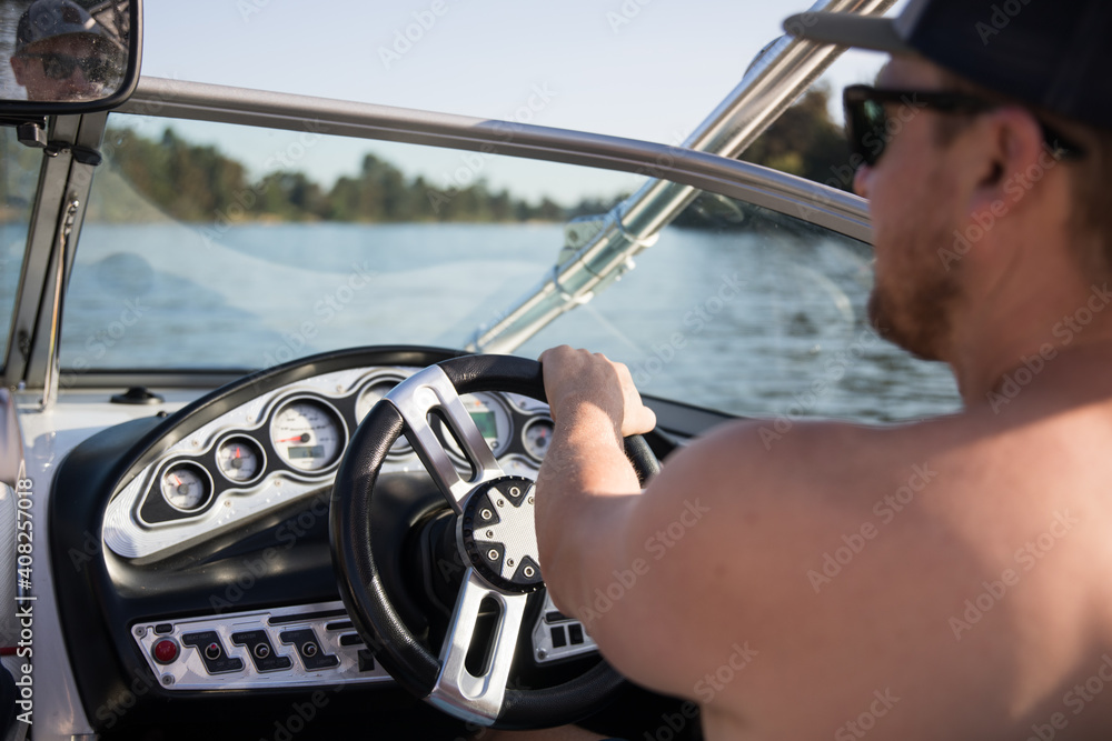 Caucasian man driving speed ski boat water hat summer sunglasses gauges fun outdoors river