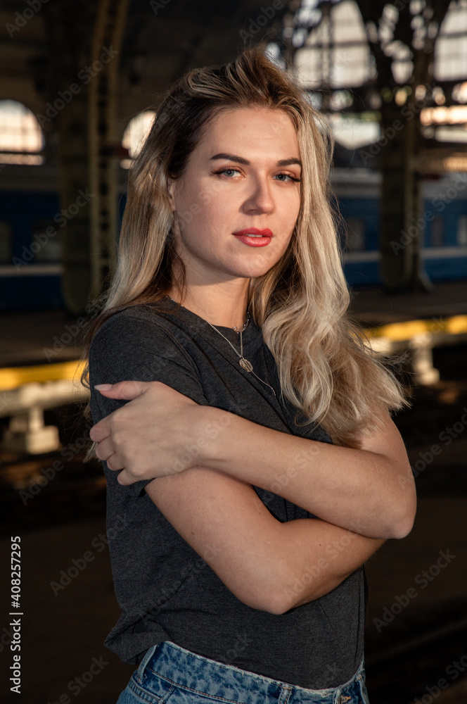 Portrait of a beautiful young blonde woman in a black T-shirt and blue jeans, illuminated by the rays of the sun, posing on the platform of the railway station.
