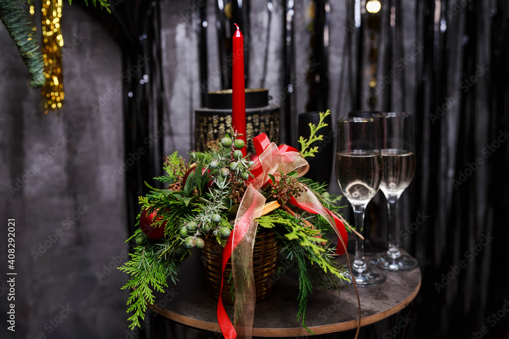 Two glasses of champagne. Party time. Dinner table setting. Luxury romantic candlelight dinner table setup for couple with beautiful light as background. Concept for valentine's day and date. Holiday