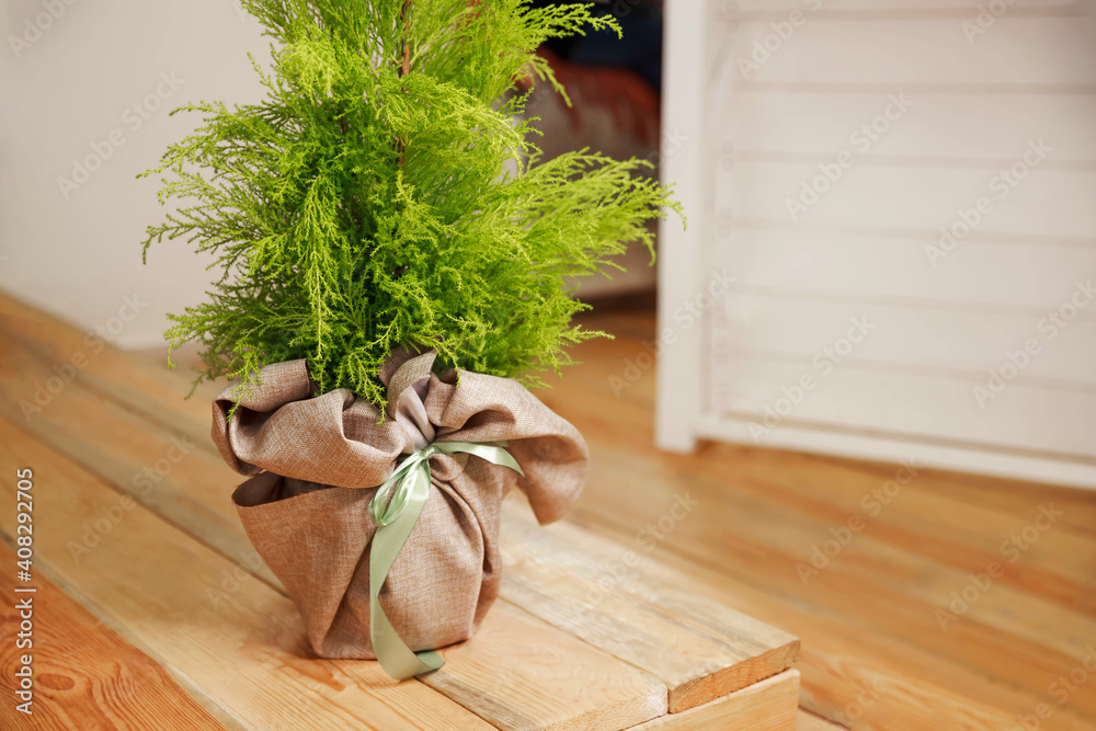 Plants in modern interior room on wooden floor. Beautiful natural home and office decorations. Floriculture. Green indoor houseplant in pot. Plant growing in planter. Potting or transplanting plants.
