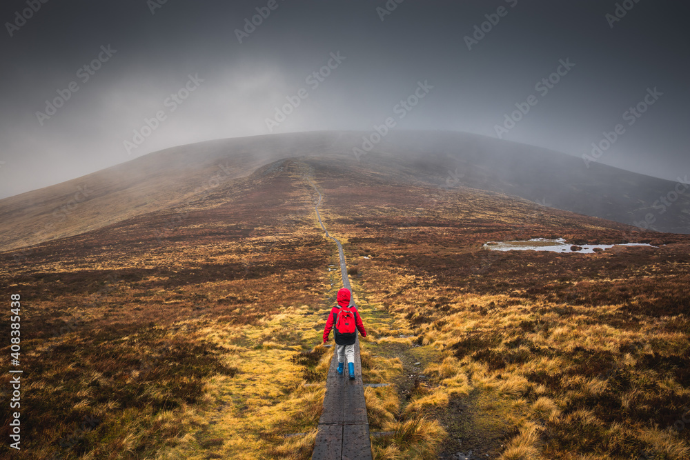 Boy in a red jacket, hiking on wooden path leading through the wicklow mountains, Djouce pek Ireland. Wooden path in foggy mountain landscape, in Autumn. 2019 Ireland