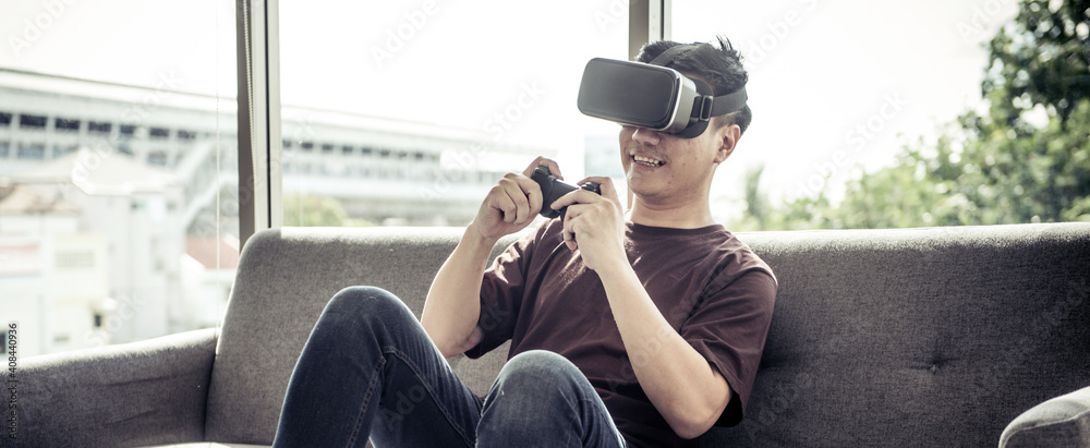 A young man is playing games through a VR system. That makes seeing a virtual image Cause a feeling