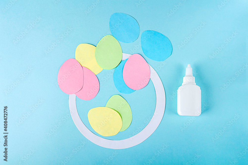 DIY and kids creativity. Step by step instruction: how to make paper easter wreath. Step4 cut out egg blanks from multi-colored paper. Childrens handmade Easter craft.