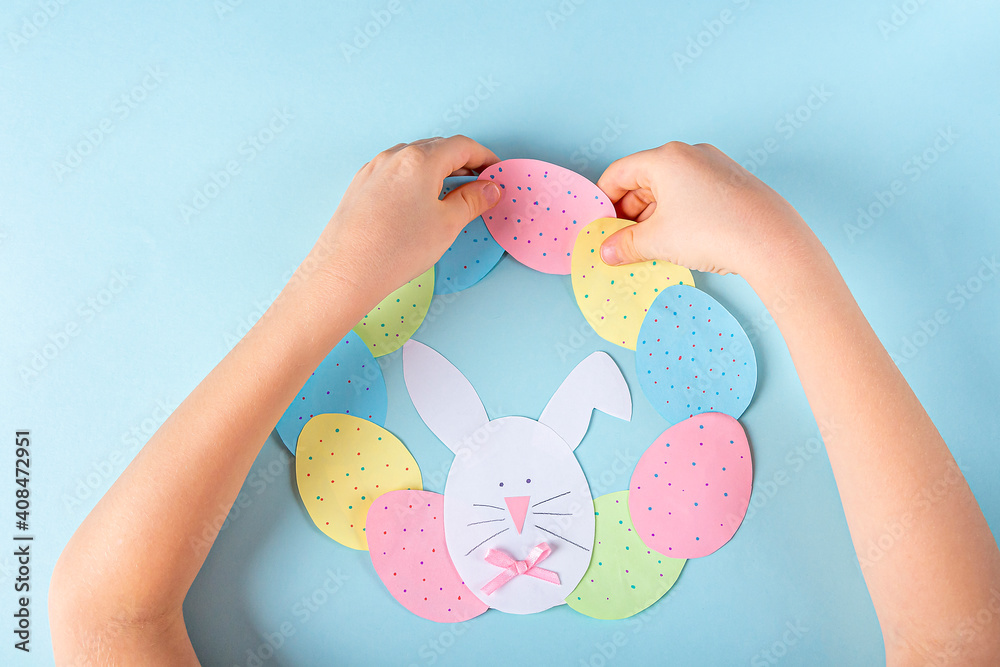 DIY and kids creativity. Step by step instruction: how to make paper easter wreath. Step9 glue paper eggs and bunny to circle like wreath. Childrens handmade Easter craft.
