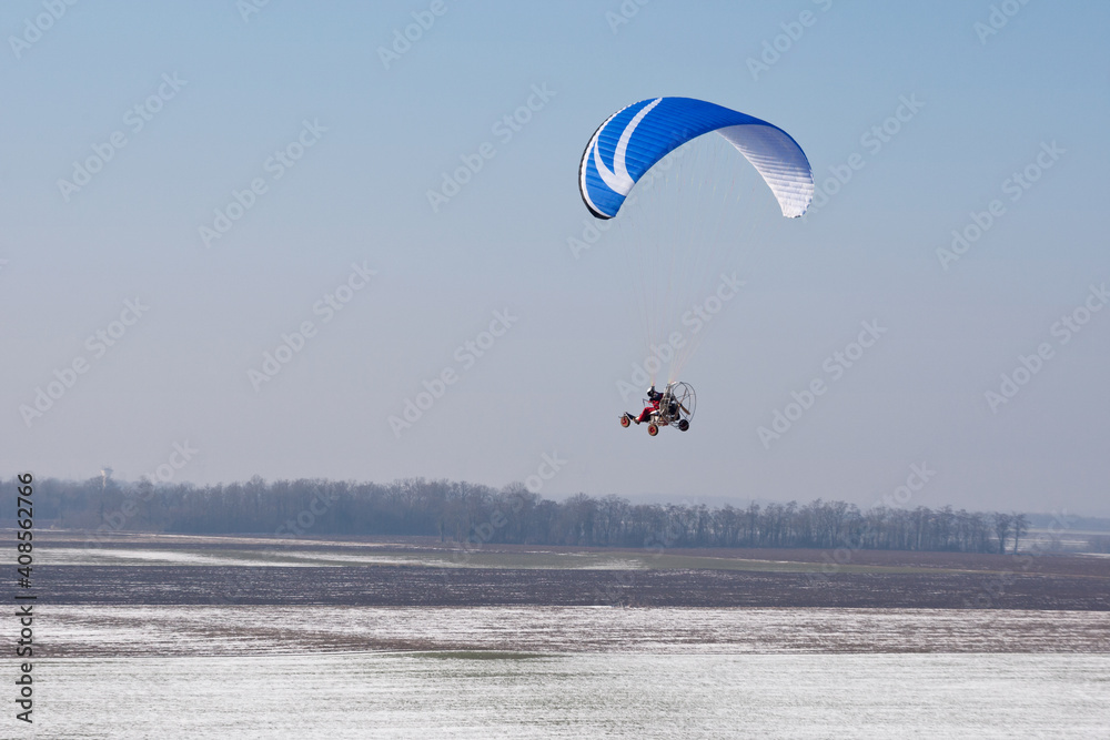 Aerial view of paramotor flying over the vastness of winter snowy French fields with horizon and blue sky
