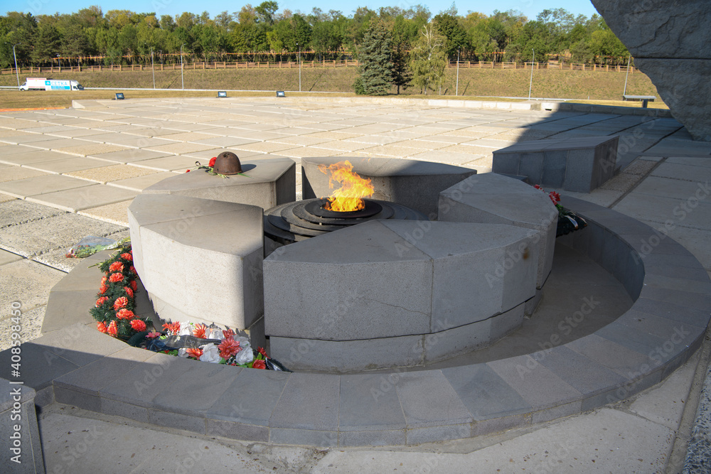 Eternal flame on the graves of 800,000 soldiers killed by the German fascists in the Sambek Heights. Rostov-on-Don, Russia
