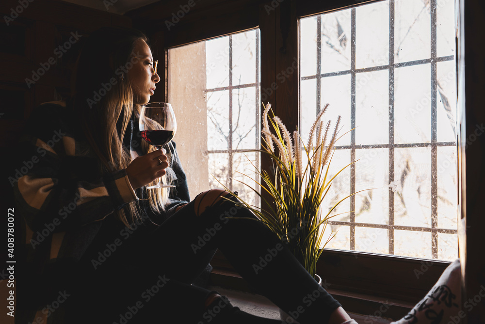 Relaxed woman at the window with glass of wine