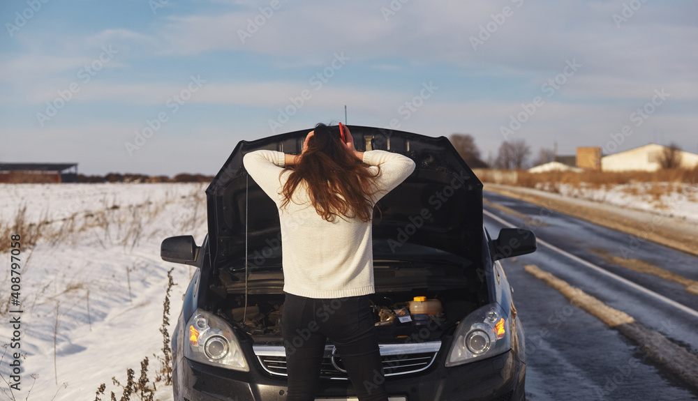 Caucasian female having a problem with car on a roadtrip Upset woman emotionally reacting on overheated car standing on the roadside with the open hood