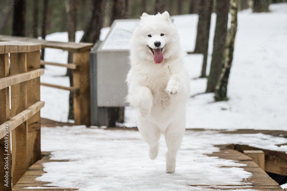 Samoyed white dog is running on snow path road Balta kapa