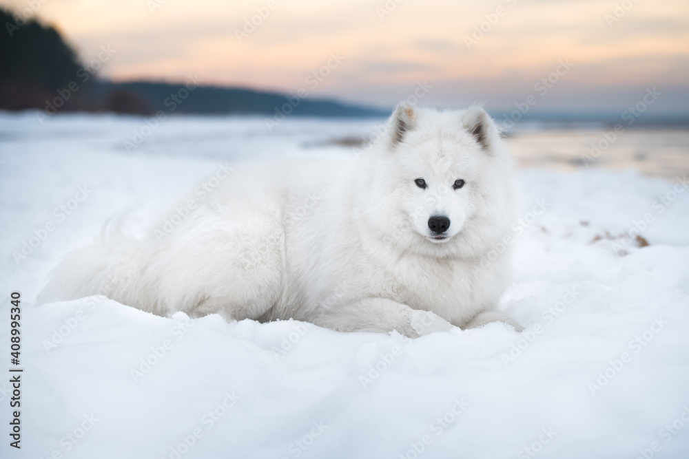 Samoyed white dog is on Saulkrasti beach in Latvia