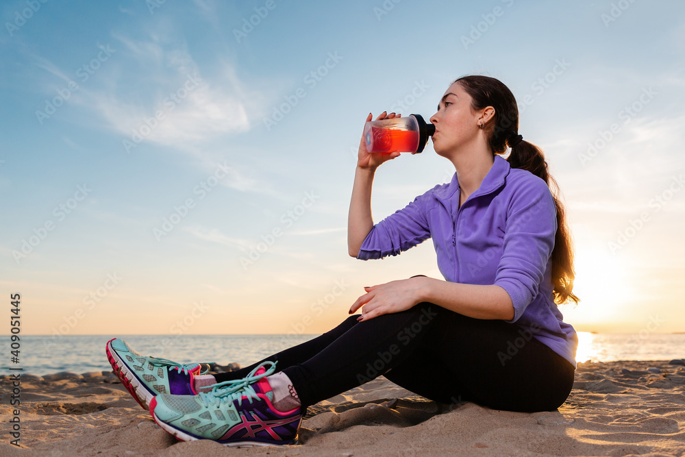 A young woman sits on the sand and drinks a protein shake from a shaker. Bottom view. The concept of a healthy lifestyle
