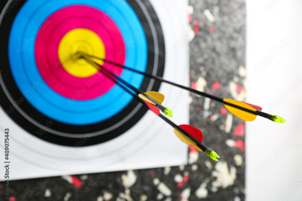 Three arrows in archery target, closeup view