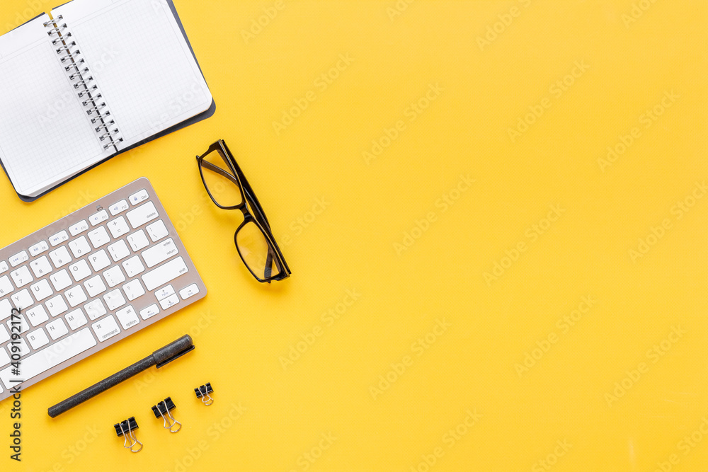 Yellow flat lay top view office table desk with keyboard and office supplies