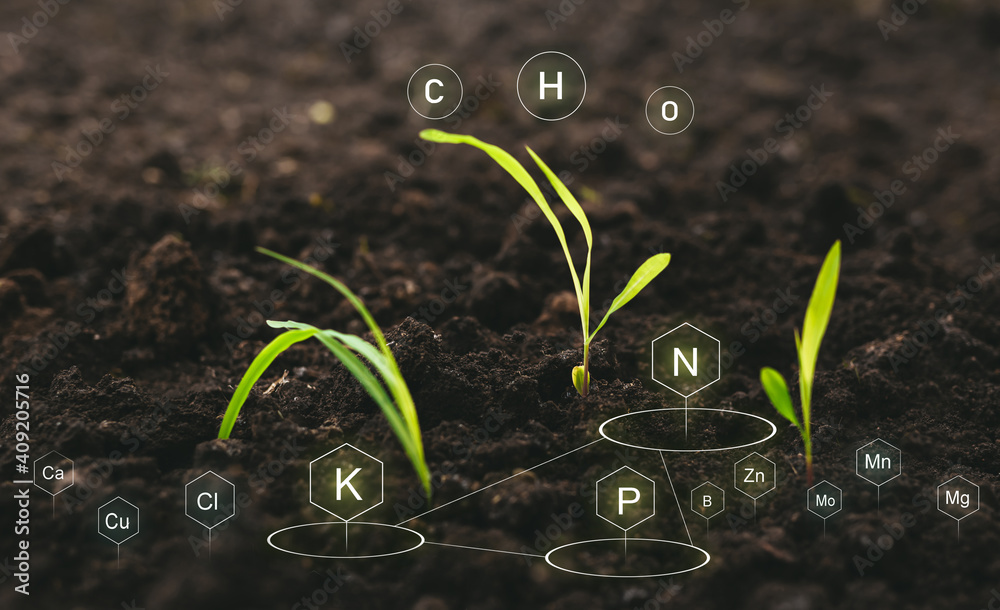 Role of nutrients in plant life for development. Soil with digital mineral nutrients icon.