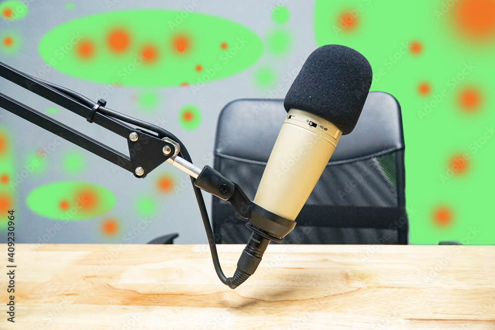 Speech microphone presents content on a wooden table and has a color background. In the recording room