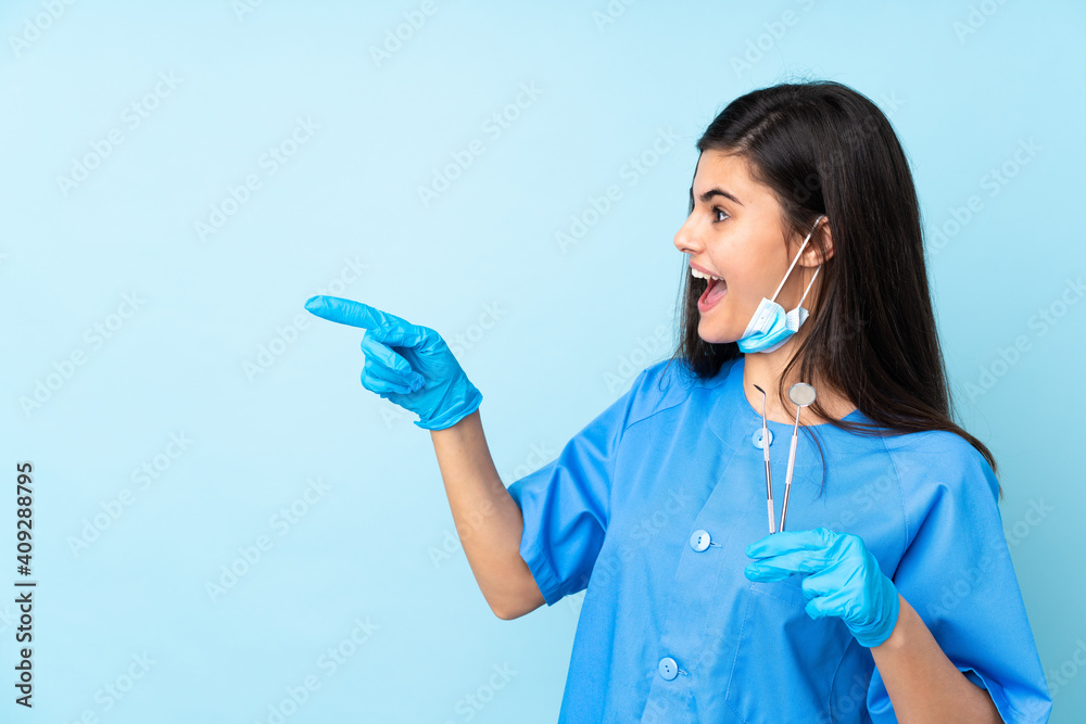 Young woman dentist holding tools over isolated blue background pointing finger to the side