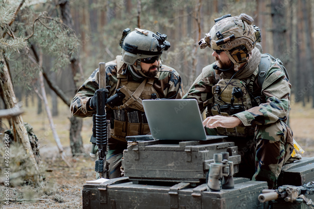 Bearded soldiers in uniform sit on military transport crates, analyze data on a laptop and work out tactics at a temporary forest base. In the background, you can see a soldier protecting the base.