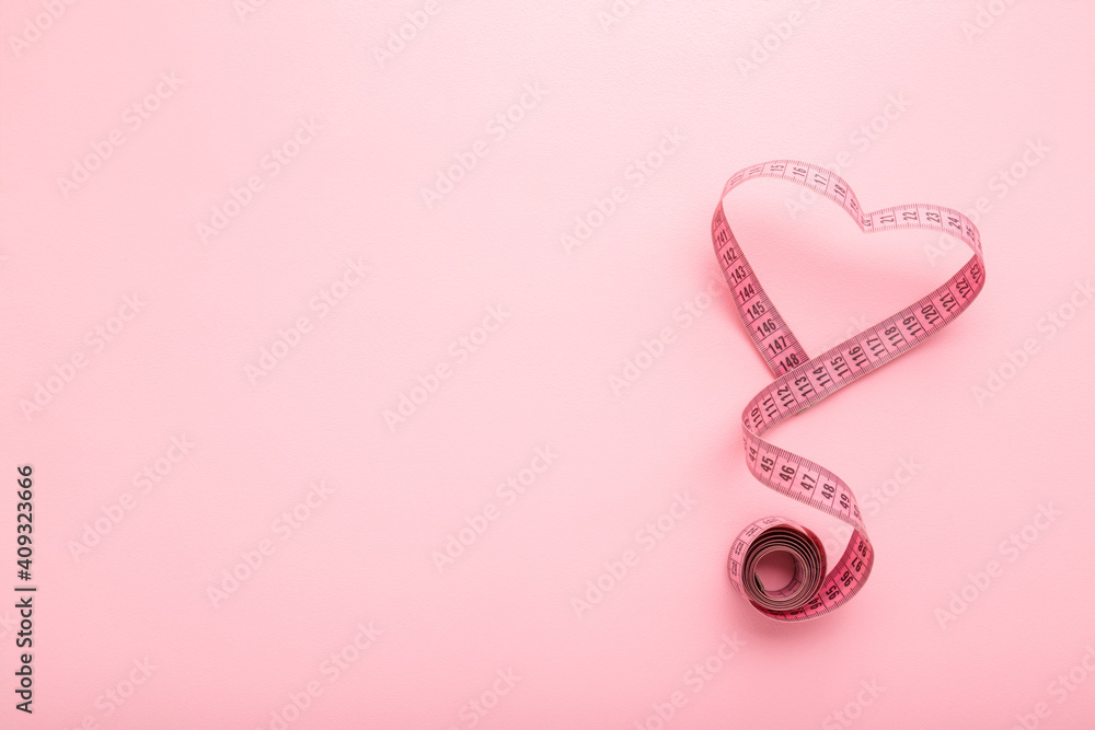 Heart shape created from rolled out measure tape on light pink table background. Pastel color. Closeup. Empty place for text. Top down view.