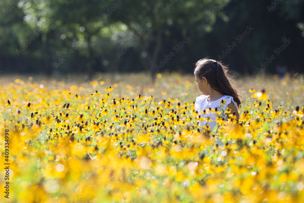 Girl gathering flowers in sunflower field. Spring in Houston, Texas, USA