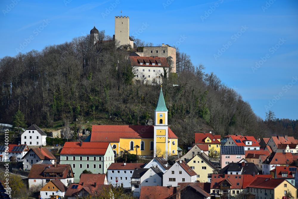 Falkenstein, a small town with a church and a fortress. Upper Palatinate,Bavaria, Germany.