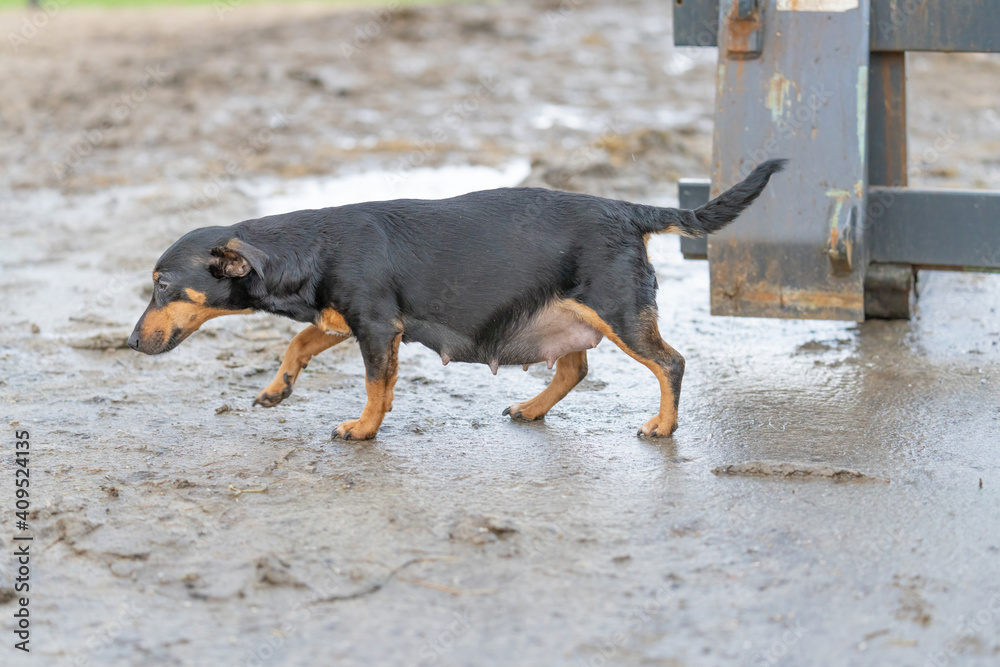 A fat pregnant Jack russel terrier. The dog is walking outside in the mud